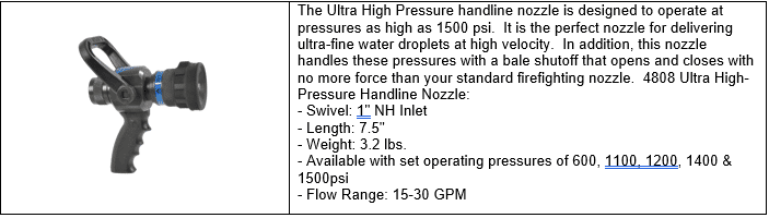 The Ultra High Pressure handline nozzle is designed to operate at pressures as high as 1500 psi.  In addition, this nozzle handles these pressures with a bale shutoff that opens and closes with no more force than your standard firefighting nozzle.